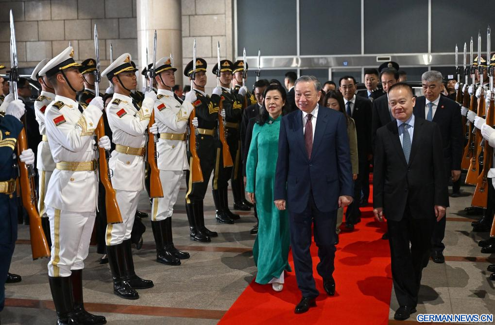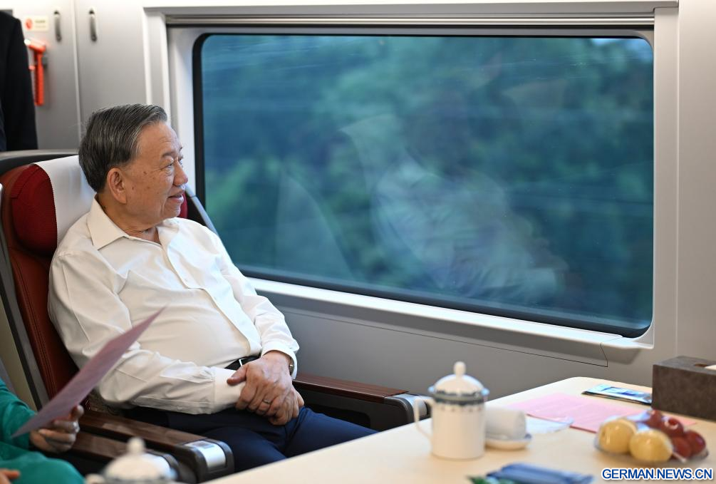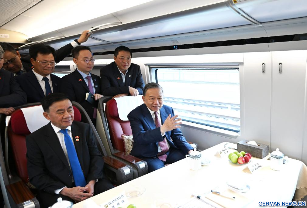 BEIJING, 16. April 2026 (Xinhuanet) -- To Lam, Generalsekretär des Zentralkomitees der Kommunistischen Partei Vietnams und vietnamesischer Staatspräsident, der sich auf einem Staatsbesuch in China befindet, verlässt Chinas Hauptstadt Beijing mit einem Hochgeschwindigkeitszug in Richtung des südchinesischen Autonomen Gebiets Guangxi der Zhuang, 16. April 2026. (Quelle: Xinhua/Dai Tianfang)
