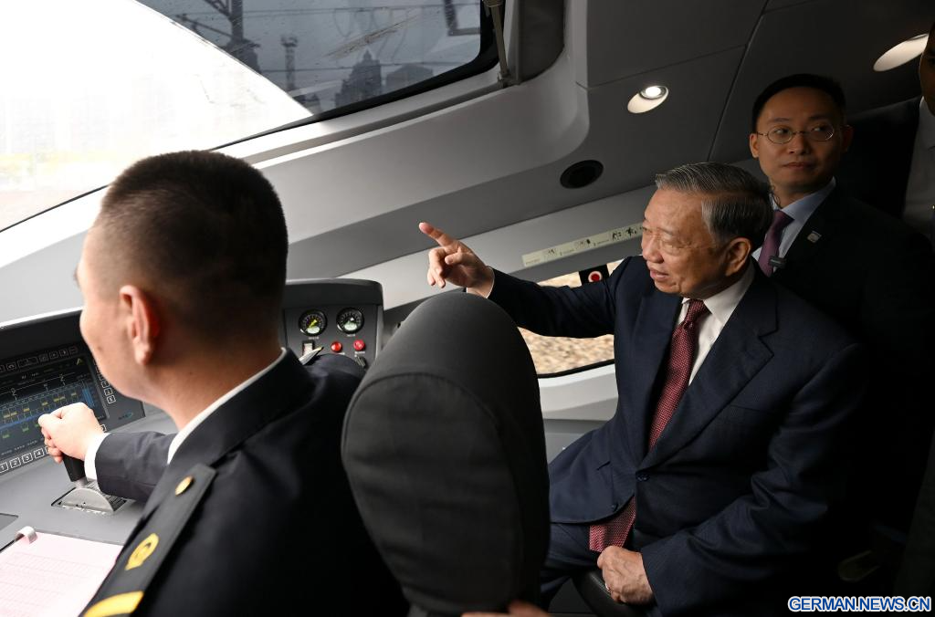 BEIJING, 16. April 2026 (Xinhuanet) -- To Lam, Generalsekretär des Zentralkomitees der Kommunistischen Partei Vietnams und vietnamesischer Staatspräsident, der sich auf einem Staatsbesuch in China befindet, besichtigt den Führerstand auf der Fahrt mit einem Hochgeschwindigkeitszug von Chinas Hauptstadt Beijing in das südchinesische Autonome Gebiet Guangxi der Zhuang, 16. April 2026. (Quelle: Xinhua/Dai Tianfang)