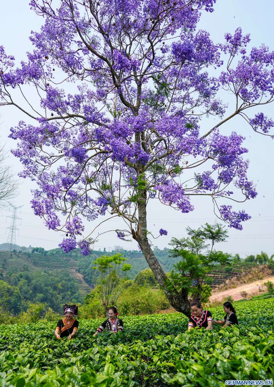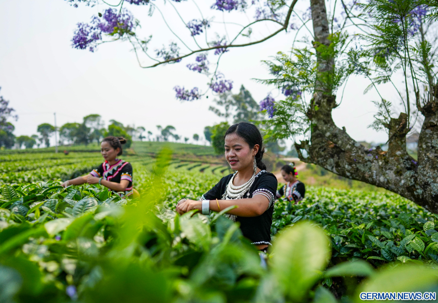 PU'ER, 16. April 2026 (Xinhua) -- Landwirtinnen pflücken Teeblätter in einem Teegarten im Bezirk Simao der Stadt Pu'er in der Provinz Yunnan im Südwesten Chinas, 15. April 2026. (Xinhua/Chen Xinbo)