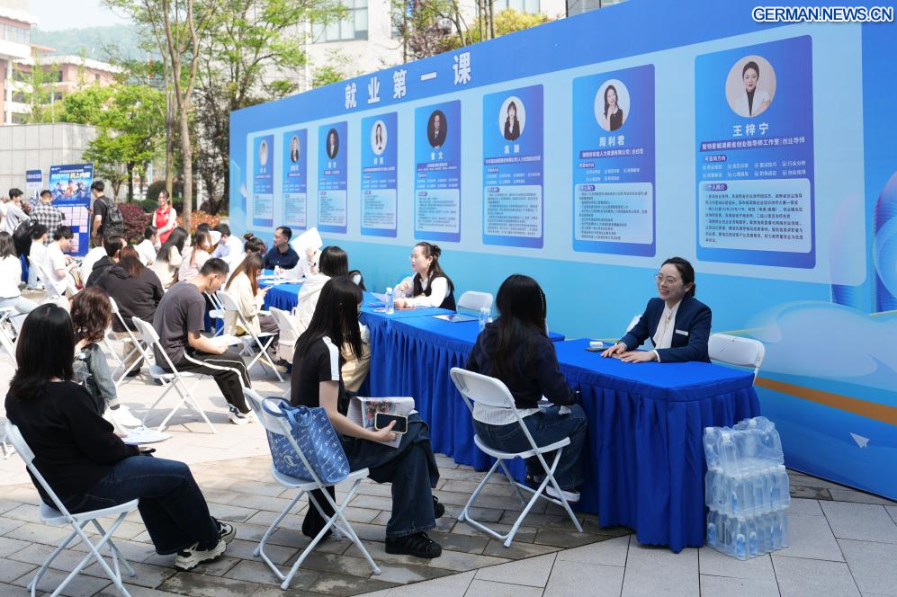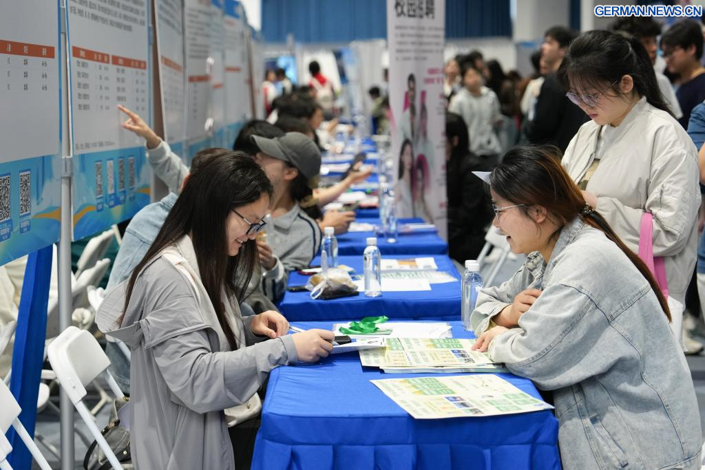 CHANGSHA, 18. April 2026 (Xinhuanet) -- Das Foto vom 18. April 2026 zeigt eine Szene von einer Jobmesse an der Hunan University in Changsha in der zentralchinesischen Provinz Hunan. Die zweitägige Jobmesse für Universitätsabsolventen begann am Samstag, wobei die Hauptveranstaltungsorte die Hunan University und die Hunan Normal University waren. (Quelle: Xinhua/Chen Zhenhai)