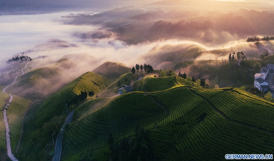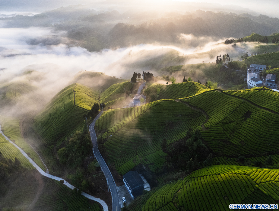 BEIJING, 19. April 2026 (Xinhua) -- Die Luftaufnahme einer Drohne zeigt Teeplantagen am Mu'er Mountain im Kreis Hefeng in der zentralchinesischen Provinz Hubei, 18. April 2026. (Foto von Qin Tao/Xinhua)