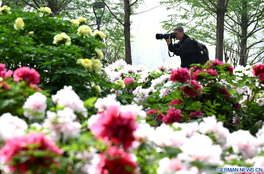 BEIJING, 19. April 2026 (Xinhua) -- Ein Hobbyfotograf macht Aufnahmen im Pfingstrosengarten des Botanischen Gartens von Shijiazhuang in der nordchinesischen Provinz Hebei, 18. April 2026. (Foto von Chen Qibao/Xinhua)