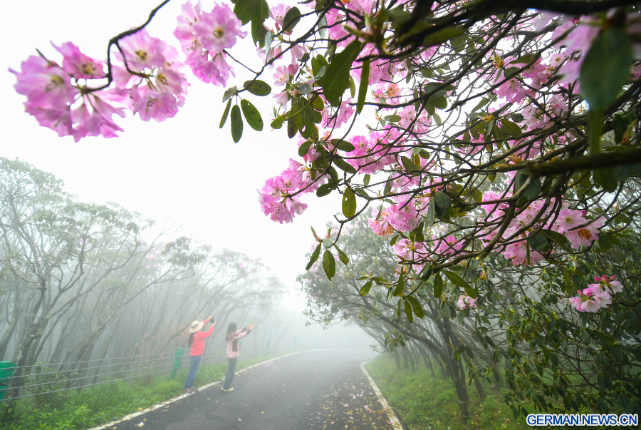 BEIJING, 19. April 2026 (Xinhua) -- Touristen machen Fotos von den blühenden Rhododendren in einem Waldnationalpark im Kreis Shuangpai der Stadt Yongzhou in der zentralchinesischen Provinz Hunan bewundern, 17. April 2026. (Foto von Zhou Xiuyuchun/Xinhua)