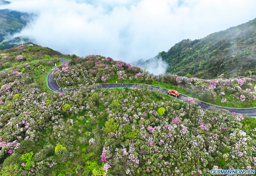 BEIJING, 19. April 2026 (Xinhua) -- Die Luftaufnahme einer Drohne zeigt Touristen, die blühende Rhododendren in einem Waldnationalpark im Kreis Shuangpai der Stadt Yongzhou in der zentralchinesischen Provinz Hunan bewundern, 17. April 2026. (Foto von Zhou Xiuyuchun/Xinhua)