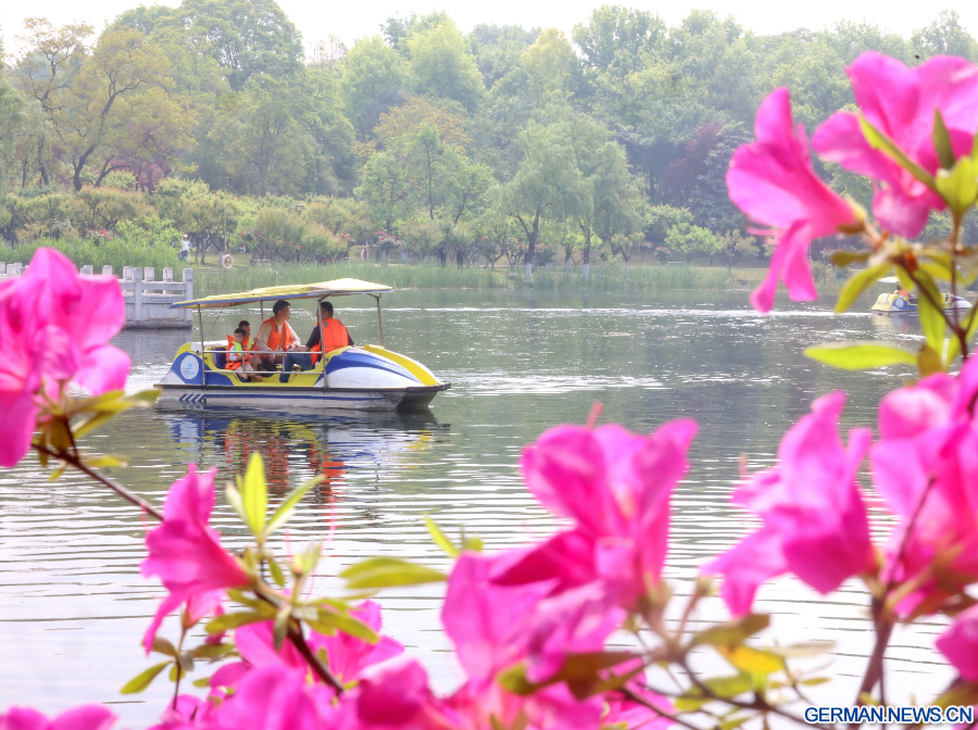 BEIJING, 19. April 2026 (Xinhua) -- Touristen unternehmen eine Bootsfahrt, um die Blüten im Qingshan-Park in Wuhan in der zentralchinesischen Provinz Hubei zu bewundern, 18. April 2026. (Foto von Zhao Jun/Xinhua)