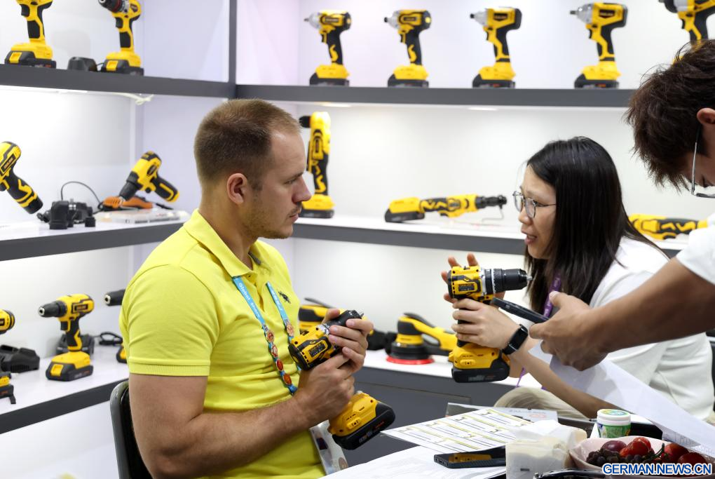 GUANGZHOU, 19. April 2026 (Xinhuanet) -- Ein Käufer informiert sich über Bohrmaschinen auf der 139. Chinesischen Import- und Exportmesse in Guangzhou in der südchinesischen Provinz Guangdong, 19. April 2026. Die erste Phase der 139. Chinesischen Import- und Exportmesse, auch bekannt als Kanton-Messe, wurde am Sonntag mit einer Rekordzahl an ausländischen Käufern abgeschlossen, wie die Organisatoren mitteilten. (Quelle: Xinhua/Lu Hanxin)